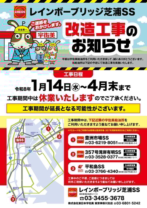 令和8年1月14日(水)~4月30日までSS改造工事に伴い、休業させていただきます。尚、工事期間中は近隣の宇佐美SSをご利用いただけますようお願い申し上げます。